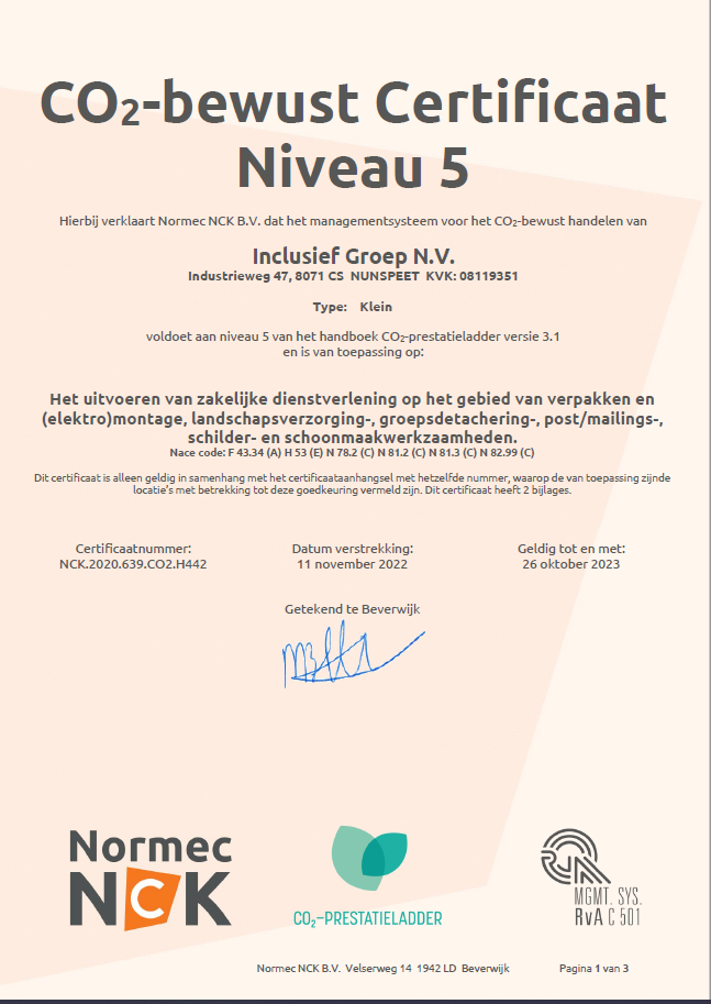Inclusief Groep heeft wederom de hoogste score behaald voor het CO2-Bewust certificaat en wij voldoen daarmee aan niveau 5 van het handboek CO2-Prestatieladder.