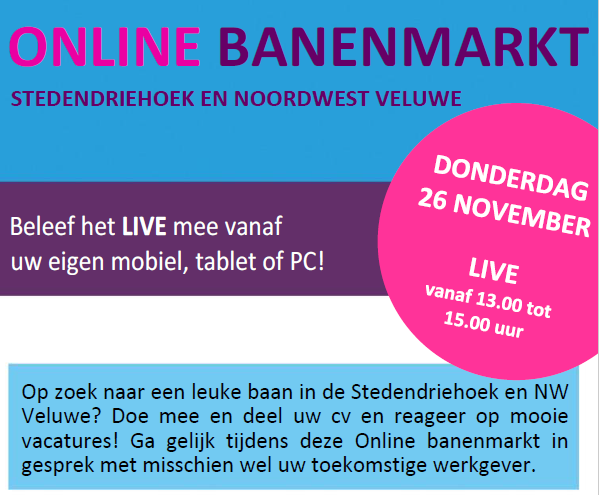 Op donderdag 26 november van 13.00 tot 15.00 uur vindt de eerste editie plaats van de Online banenmarkt Stedendriehoek en NW Veluwe. Deze ‘coronaproof’ banenmarkt wordt georganiseerd door diverse regionale partijen uit de regio Stedendriehoek en NW Veluwe (FactorWerk). Voor werkgevers en werkzoekenden!